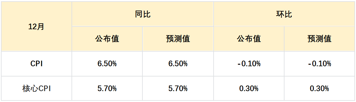 美国12月CPI环比涨幅-0.1%,预期 -0.1%,前值 0.2%。
