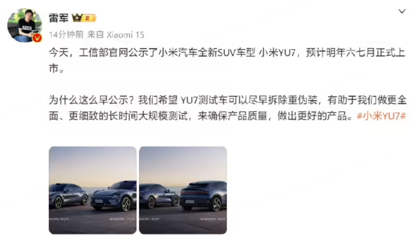 据小米汽车微博消息,小米SUV新车——YU7预计于明年六、七月正式上市。