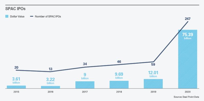 SPAC概念在美股一直都存在,但是去年到今年才算是彻底让大众熟知,根据研究公司Deal Point Data的数据,2020年共完成247笔SPAC上市,融资750亿美元(占整个IPO市场的48%),均创下历史记录。