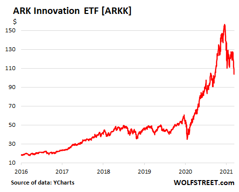 提到科技公司就不得不关注ARK的创新型ETF,它主要追踪“颠覆性的,具有改变世界运作方式的产品或服务”,该基金从2月高点也下跌超30%。
