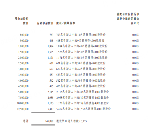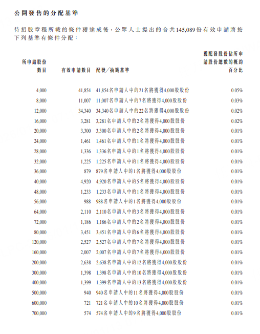 其中,公开发售接获14.51万份有效申请,超额认购10744.13倍,认购一手4000股,中签率0.05%。国际发售方面,轻微超购0.01倍。