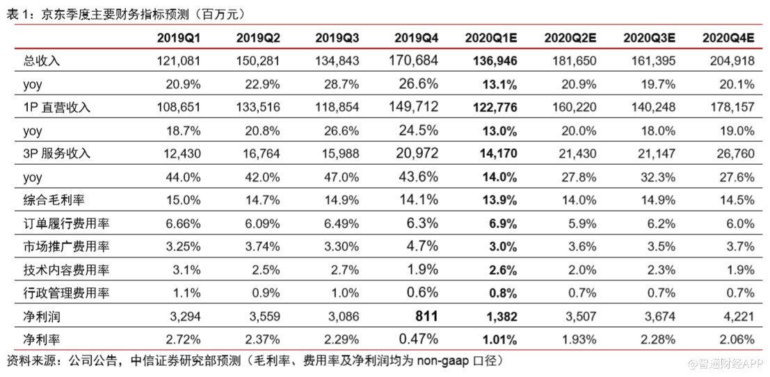 自营保证成长,预计Q1单季收入增长13%。京东采销和物流端的自营网络在公共卫生事件下发挥关键作用,但考虑到公共卫生事件对用户端需求的冲击、人工和防疫成本的上升,预计Q1京东收入端保持双位数增长,但利润率同比有所下降。