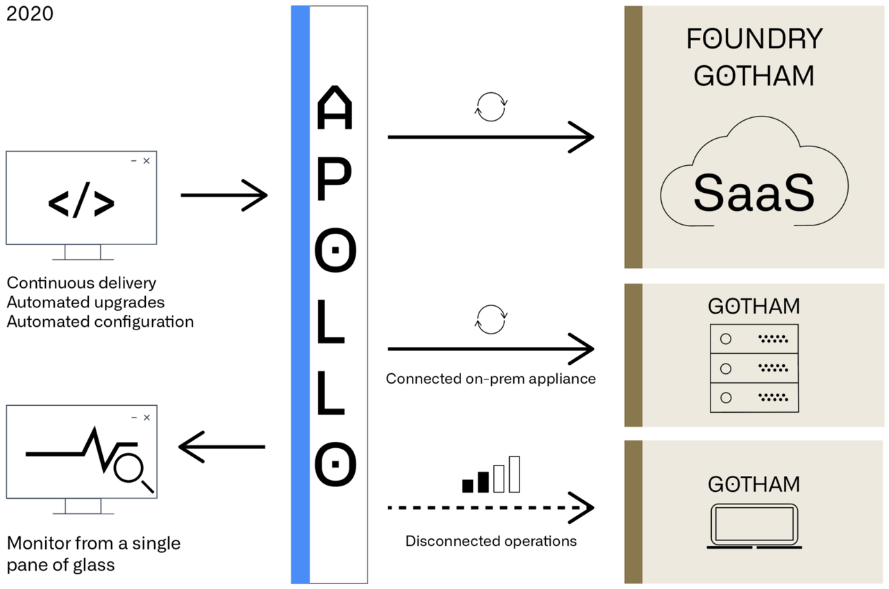Apollo is a continuous delivery system that manages and deploys Palantir Gotham and Foundry. It was built out of the need for customers to use multiple public and private cloud platforms as part of their infrastructure. Apollo allows Palantir to provide software as a service (SaaS) across various terrains, environments, and scenarios, allowing ease of use and deployment across cloud, on-premises, and classified networks. Apollo is the piece that is able to securely bring together and scale both Foundry and Gotham.