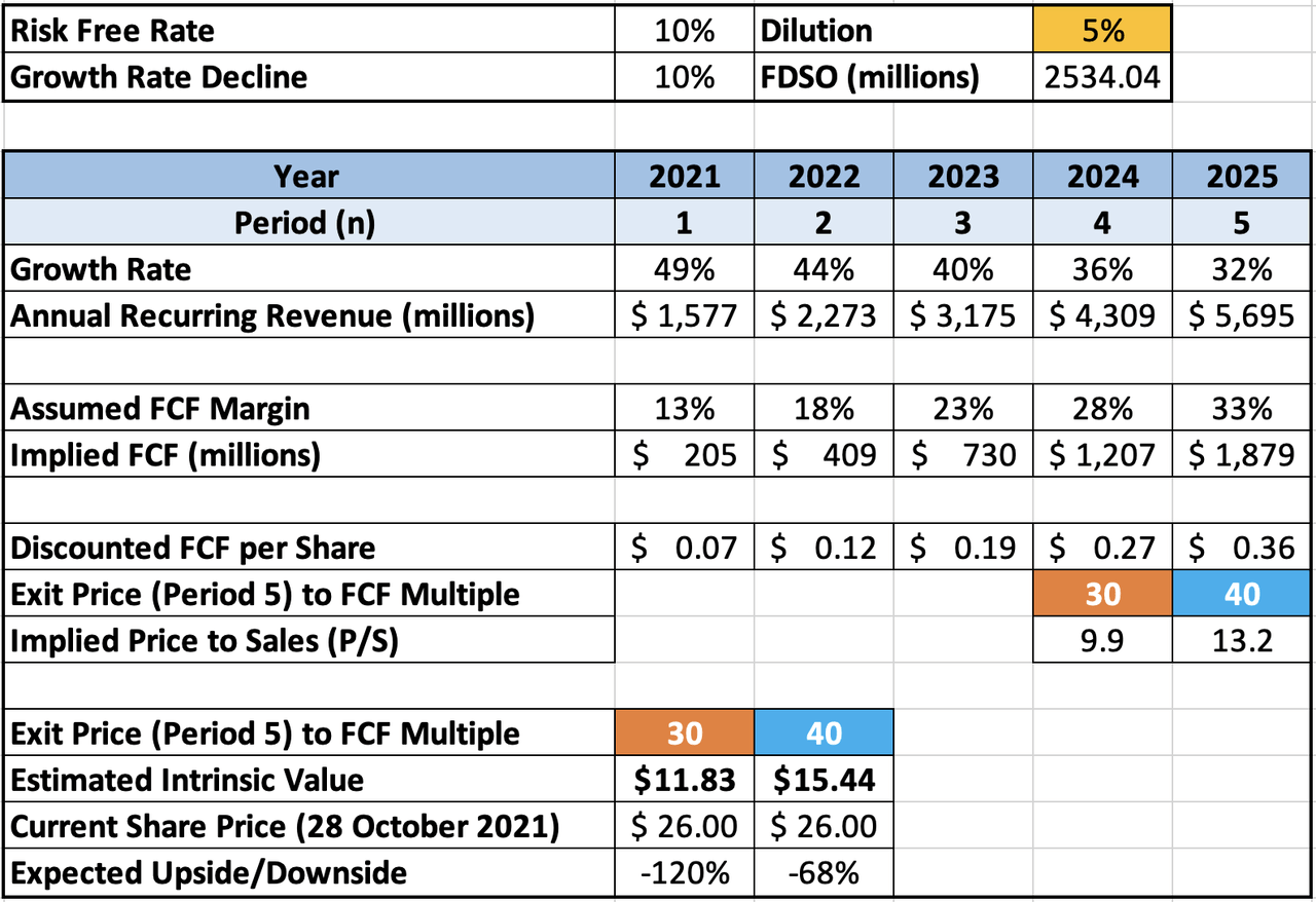 The assumption for the above valuation model is that growth eventually tapers down according to management’s estimation of 30% from 2021 to 2025. However, we are of the belief that Palantir could continue growing as they are fast becoming one of the most important software companies in the world.