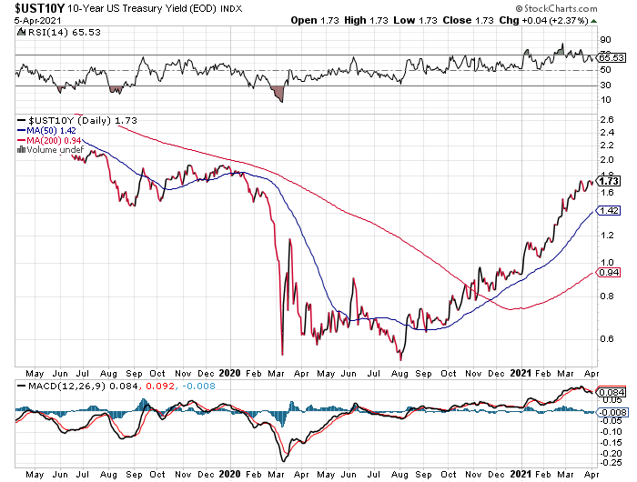 Indeed, the benchmark 10-year Treasury yield has climbed sharply in recent months and is currently at 1.73% vs. roughly the 0.5% level briefly touched last August.