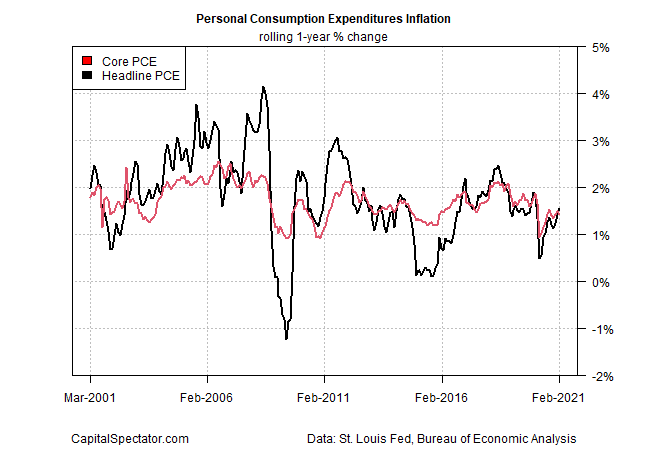 Even without a sharp ramp-up in economic growth, it's likely that inflation in the near term will revive as last year's deflationary coronavirus shock fades in the year-over-year data. The question is whether there's more than a one-time bounce that will lift and maintain pricing pressure beyond the next several months? The disinflation forces that have been in play are still relevant and so it's not yet obvious that higher, permanent inflation is a high-probability forecast.