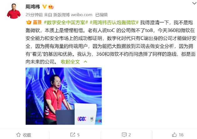 7月30日午间消息,针对自己微软做安全就完全抄袭了360的模式的言论,周鸿祎发微博澄清称,“我不是炮轰微软,本质上是惺惺相惜。”周鸿祎称,360和微软不约而同选择了同样的路线,都是面向未来的公司。