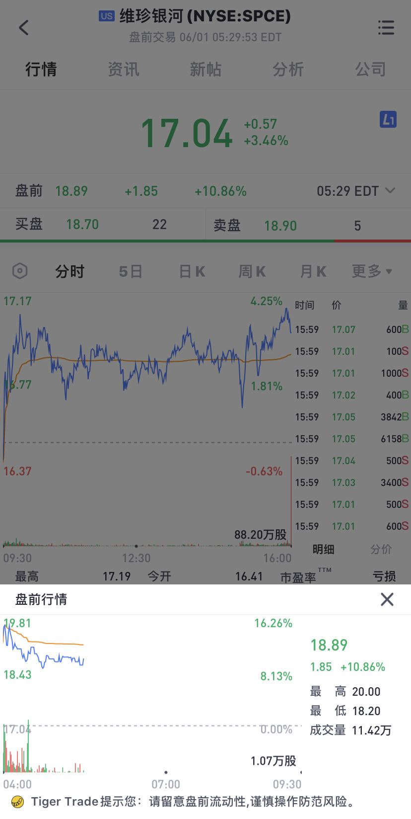 6月1日,维珍银河盘前涨近11%,SpaceX首发成功,资本市场聚焦商业发射。