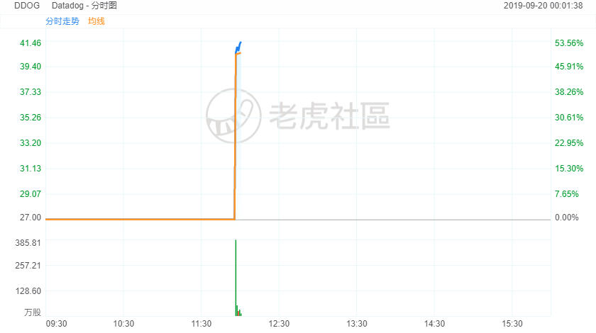 当地时间9月19日,美国云应用监控服务商Datadog$(DDOG)$(数据狗)登陆美股,发行定价27美元,开盘报40.35美元,盘初快速涨逾50%,盘中最高报41.44美元。