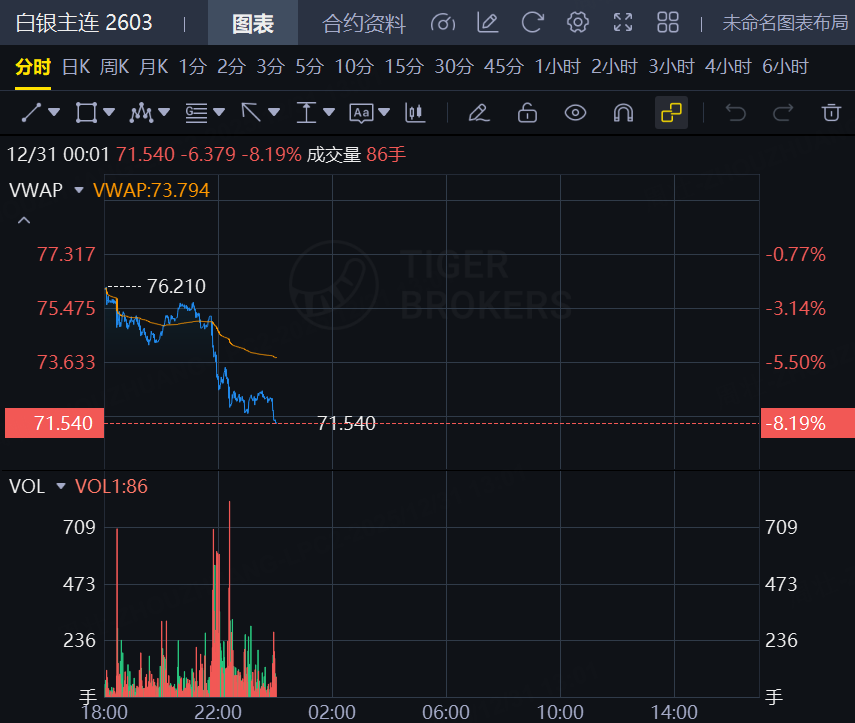12月31日,现货白银日内暴跌6%,现报71.58美元/盎司;纽约期银日内跌超8%,现报71.59美元/盎司。