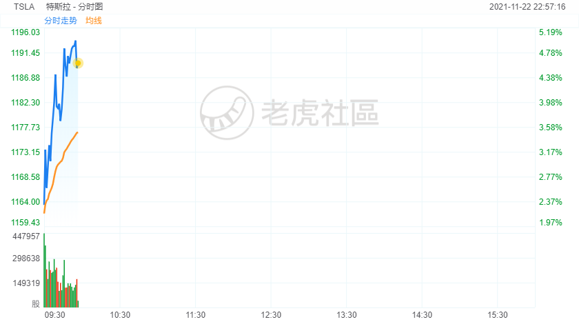 特斯拉涨5%股价逼近1200美元,市值近1.2万亿