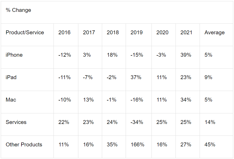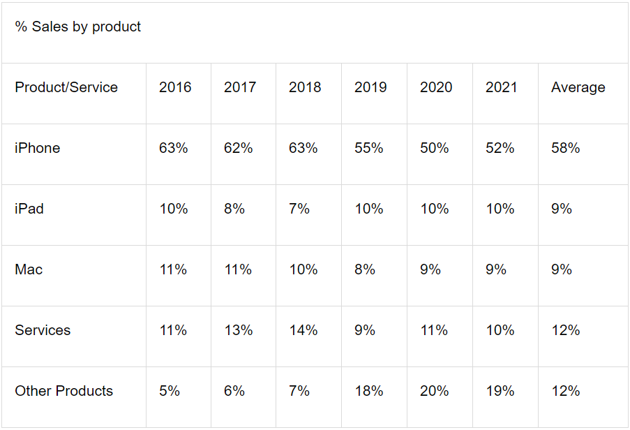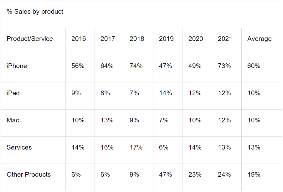 As seen in the above table, the linear average increase of iPhone sales from 2016-2021 has been around 5% annually, but until 2020, iPhone sales were slowing by roughly 2% annually. We also need to calculate the sales percentages for each product over the last five years based on the percent change from one year to the next. For that, we combine data from tables 1 and 2 to arrive at the table below, which shows each product's share of revenues based on the sales trends.