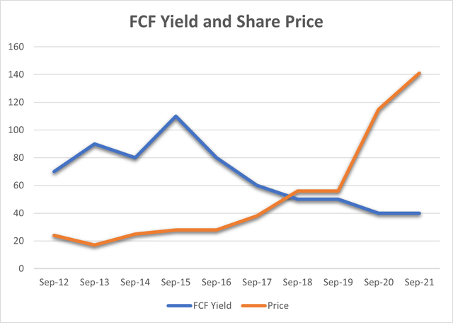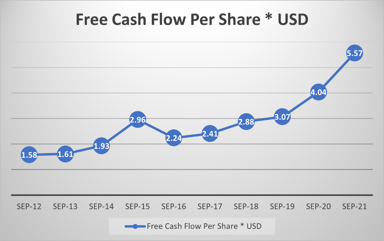 The free cash flow per share is illustrated in the chart below. The growth is steady as the company can generate a lot of cash due to the popularity of its products.