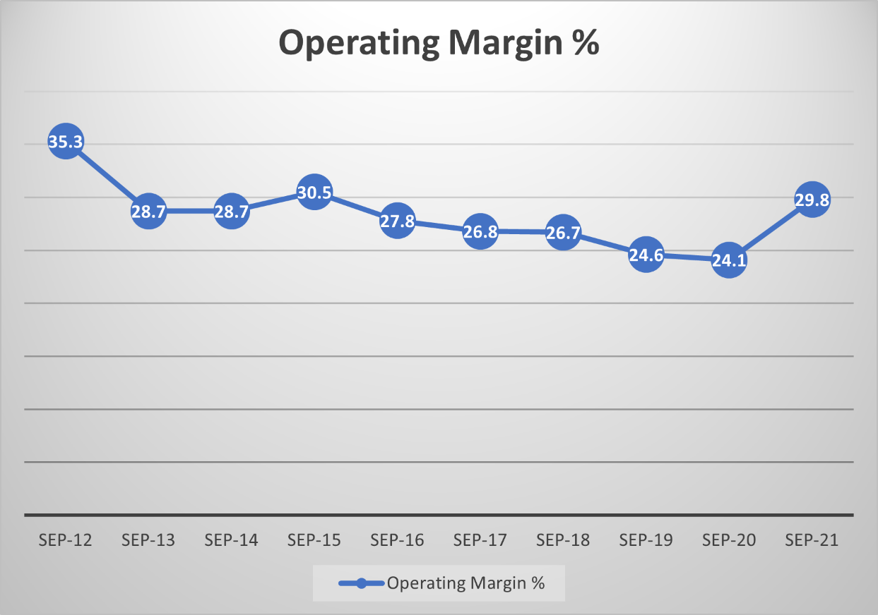 The operating margin is good at over 25%, considering the fierce competition in the tech sector, where margins are always being tested in order to gain market share.
