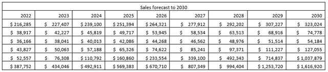 Now that we have enough numbers to work with let's plug them in to forecast revenues for the next ten years. One thing worth noting is that the 2021 sales for each product have increased substantially once the pandemic restrictions began lifting, and such numbers are outliers and not sustainable during the next fiscal period. So we can expect a decrease in revenue growth in 2022, and I have calculated that decrease according to the sales trend before the pandemic.