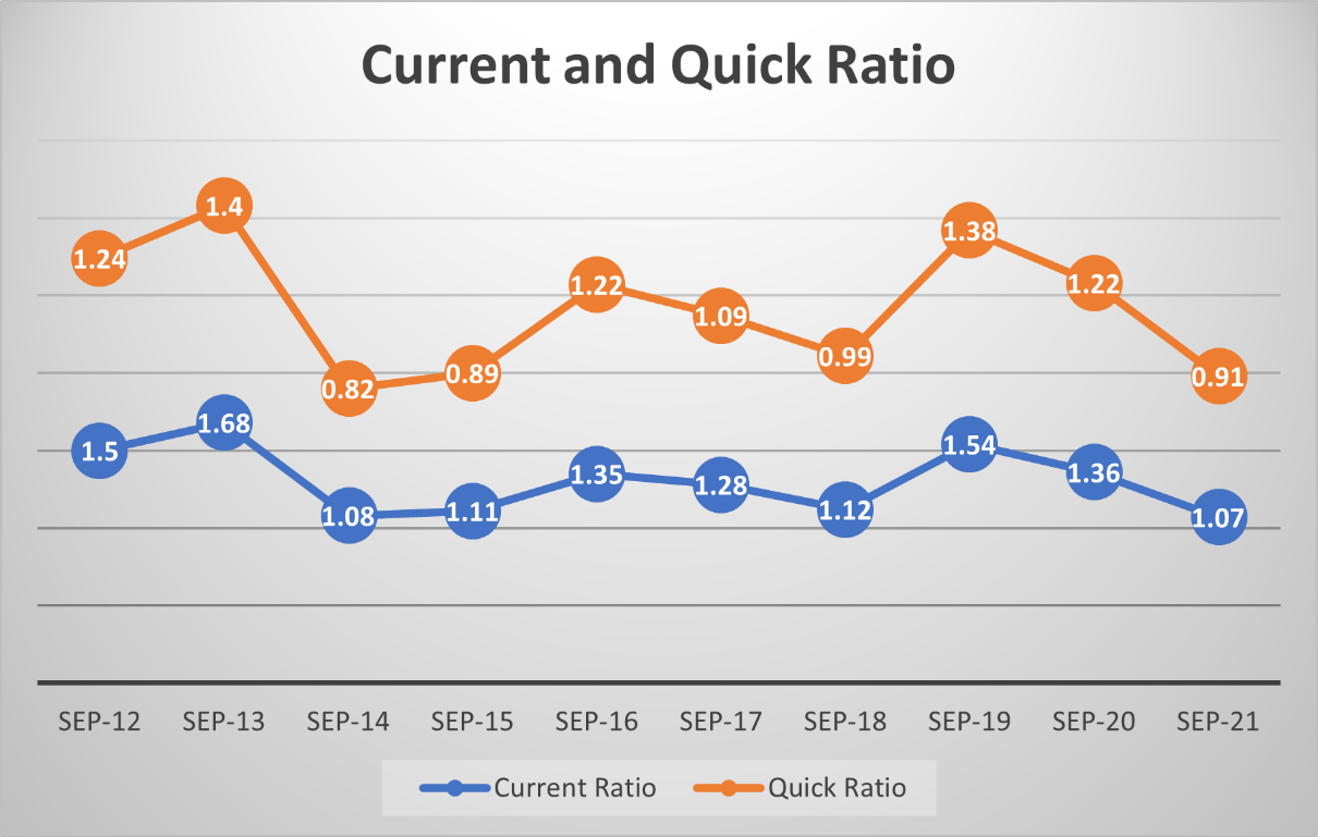 The current and quick ratios have been declining in the last two years, correlated with the increase in liabilities. The quick ratio is slightly concerning due to having a value below 1, and the current ratio is not healthy either.