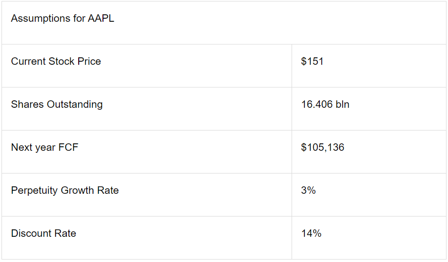 So now that we have all the required numbers, we can plug them into the formula to estimate the FCF up to 2030. Then, we can use the FCF values in the discounted cash flows formula to evaluate the current fair value of Apple stock.