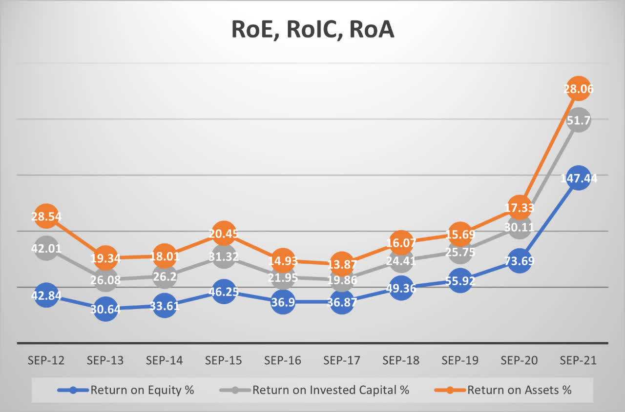 The same can be observed with the return on equity, invested capital, and assets. All these three metrics have seen a jump in the last year, with the return in equity being the highest.