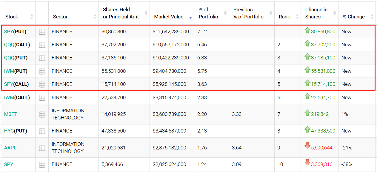 罗素2000指数ETF看跌期权(IWM.US,PUT)位列第四,持仓约5553万股,持仓市值约94亿美元,占投资组合比例为5.75%。