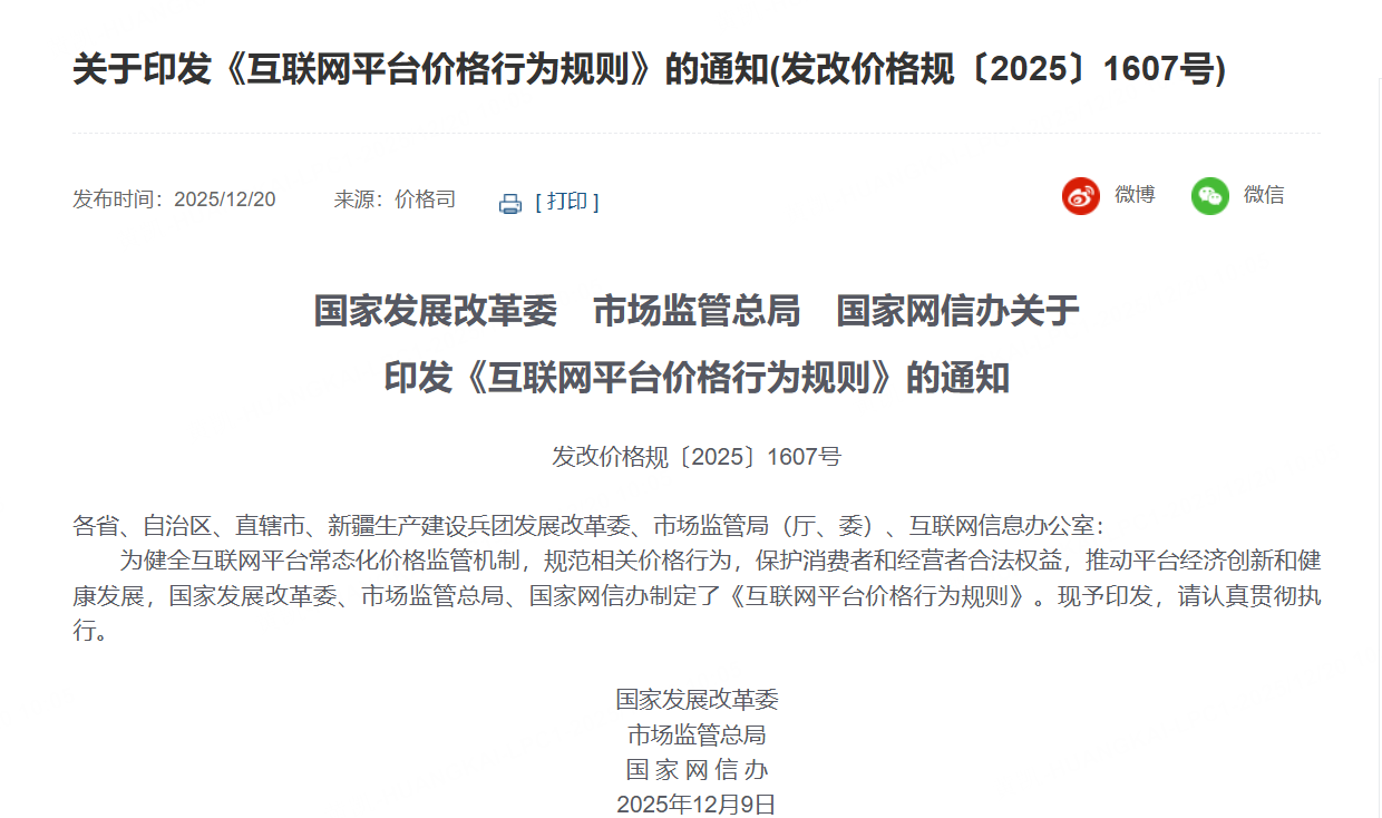 12月20日,为健全互联网平台常态化价格监管机制,规范相关价格行为,保护消费者和经营者合法权益,推动平台经济创新和健康发展,国家发展改革委、市场监管总局、国家网信办制定了《互联网平台价格行为规则》。