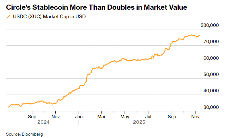 营收增至7.4亿美元,高于彭博社调查的分析师平均预期7.074亿美元。总部位于纽约的Circle公司周三在一份声明中表示,持续经营净利润为2.14亿美元,合每股0.64美元。这其中包括6100万美元的所得税收益,该收益源于股权激励支出、研发税收抵免以及近期生效的美国税法的影响。净利润还包括因第三季度股价下跌导致可转换债券公允价值下降而产生的4800万美元收益。运营支出同比增长70%,主要原因是薪酬支出增加。