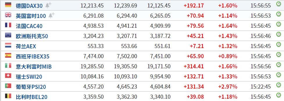 欧洲主要指数集体上涨,欧洲斯托克50指数涨1.43%,英国富时100指数涨1.14%,德国DAX30指数涨1.60%。