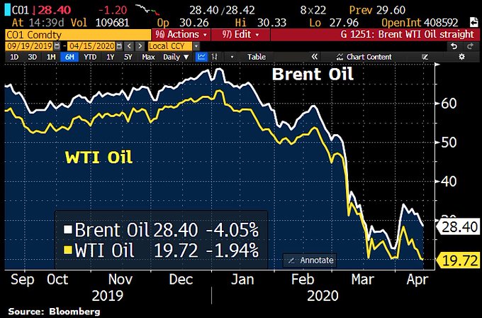 随着周三公布的多项美国经济数据比华尔街担心的还要糟,不少经济学家已发出“美国经济已然是一片废墟”的哀叹。美国股市周三下跌,因黯淡的经济数据和企业第一季业绩加剧人们对冠状病毒疫情造成的经济损害的担忧。此外,美国WTI原油隔夜也跌破了上月末创下年内低点,刷新18年低位19.20美元。此前美国报告史上最大单周原油库存增幅,而全球需求预计将因冠状病毒大流行而跌至25年低点。
