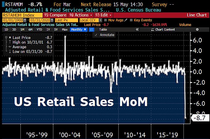 数据显示,美国3月份零售销售下降了8.7%,为记录数据以来的最低水平,纽约地区制造业活动亦创历史新低,跌幅达到令人震惊的78.2%;此外美国3月工业产出月率下跌5.4%,创1946年以来最大降幅。这几份报告数据甚至比华尔街预期的还要可怕,并且预示着4月份经济活动的下滑将更加严重。