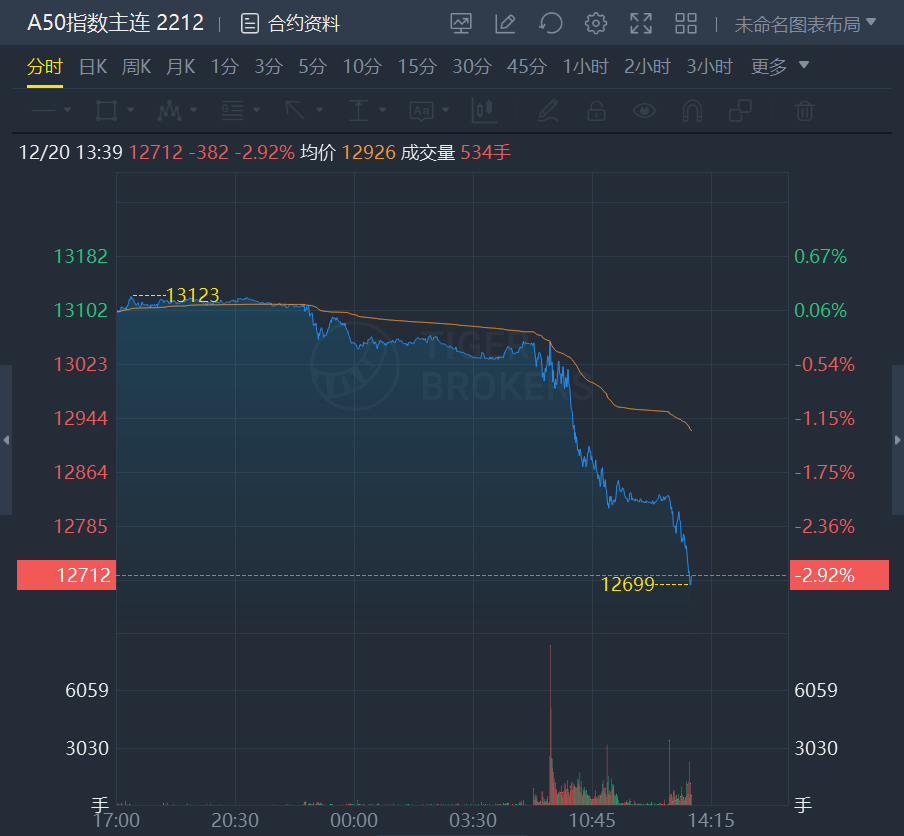 12月20日,富时中国A50指数期货持续走低,跌幅一度达3%。