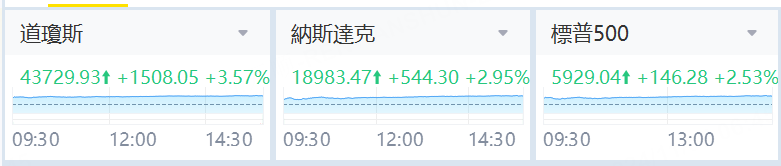 美国股市周三大幅上涨,主要股指创下历史新高。道琼斯工业指数飙升1,508.05点,收于43,729.93点,涨幅3.57%。蓝筹股道琼斯指数上一次单日涨幅超过1000点是在2022年11月。