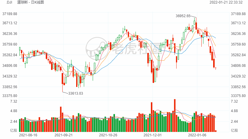 1月21日(周五),道琼斯指数开盘下跌76.63点,跌幅0.22%,报34638.76点;标普500指数开盘下跌16.21点,跌幅0.36%,报4466.52点;纳斯达克综合指数开盘下跌98.3点,跌幅0.69%,报14055.7点。
