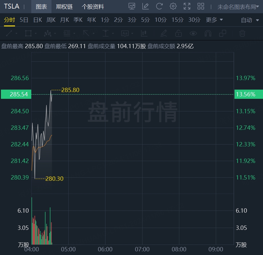11月6日,特斯拉股价在美股盘前上涨13%,投资者押注该公司将成为特朗普第二次入主白宫的主要受益者。