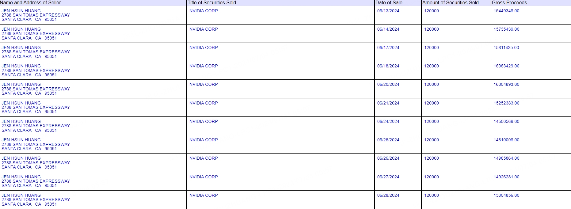 7月4日,英伟达CEO黄仁勋6月份减持了价值近1.69亿美元的英伟达股票,这是他单月减持的最多股票。市场对用于驱动人工智能的芯片的巨大需求推动该公司股价再创新高。