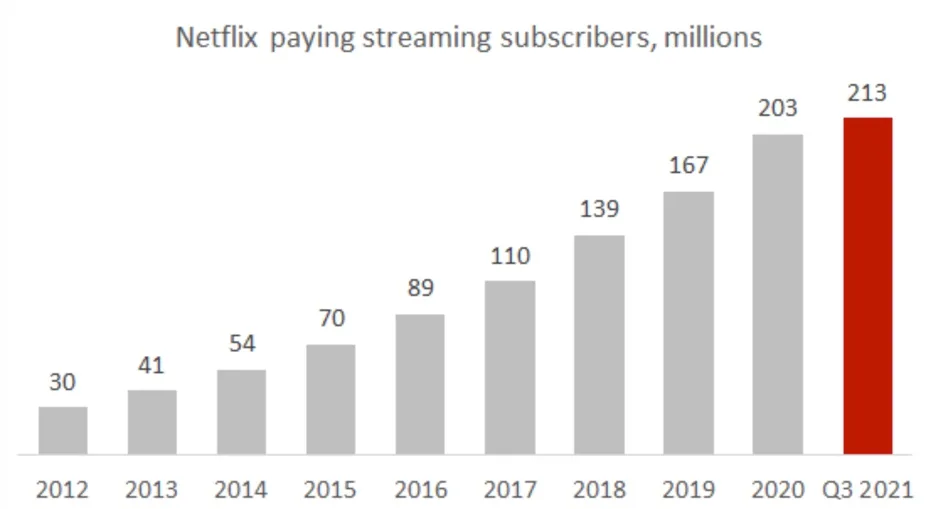Netflix is the largest video streaming service in the world by market share. It has nearly one-third of the market, with more than 210 million paying members in more than 190 countries.