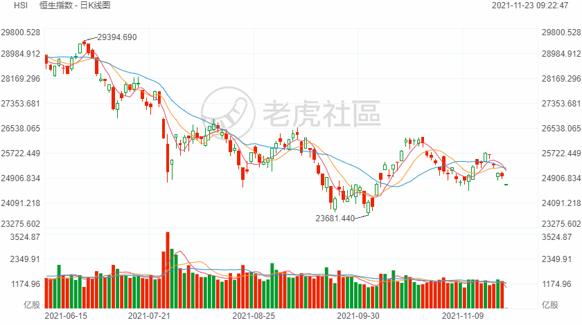 11月23日讯,港股三大指数大幅低开,恒指跌1.05%报24688点,国指跌1.08%报8833点,恒生科技指数跌1.48%报6315点。盘面上,大型科技股继续下跌,京东跌4%,哔哩哔哩(09626)$跌近4%,阿里巴巴跌3%,百度、网易、腾讯皆跌超2%,内房股、濠赌股、汽车股、体育用品股、保险股等纷纷走低,龙湖集团跌近4%,比亚迪股份跌近2%。另一方面,国产新冠特效药有望12月底前获批附条件上市,生物制药股多数上涨,沛嘉医疗高开逾7%,腾盛博药涨2.48%,在线教育股延续昨日强势行情,新东方在线涨1.53%。