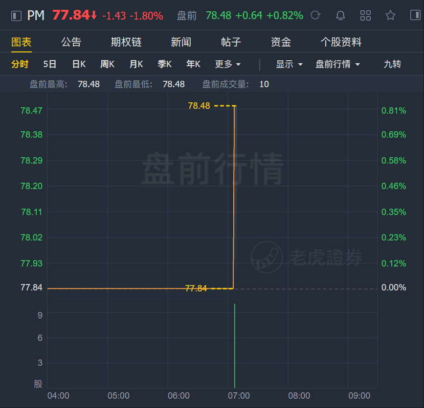 财报发布后,菲利普莫里斯盘前股价迅速拉涨,截止发稿,涨0.82%,报78.48美元。