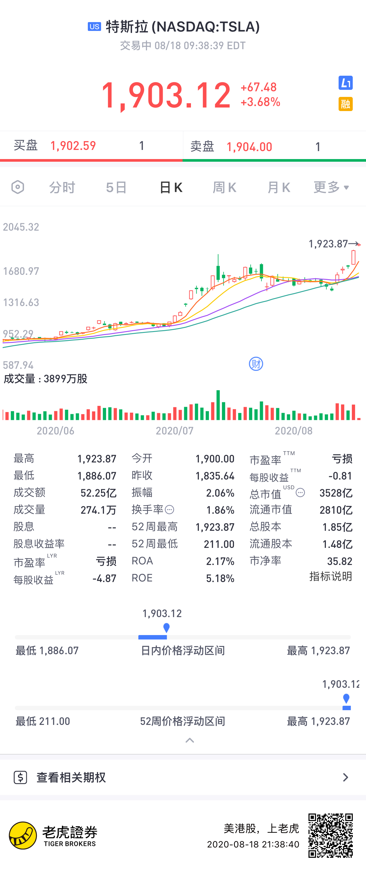 特斯拉盘初涨3.68%,盘中股价创新高至1923.87美元