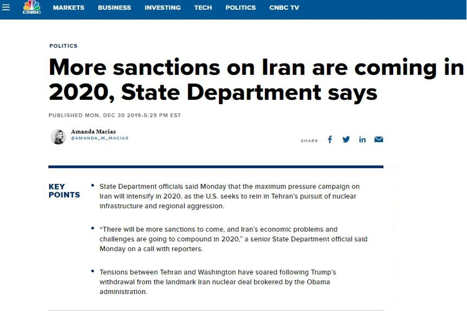 CNBC:美国务院称,2020年会对伊朗施加更多制裁