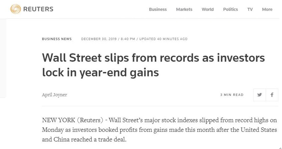 本周一,美股三大股指跌落创纪录高位,投资者锁定本月中美达成贸易协议后的收益,套利离场。