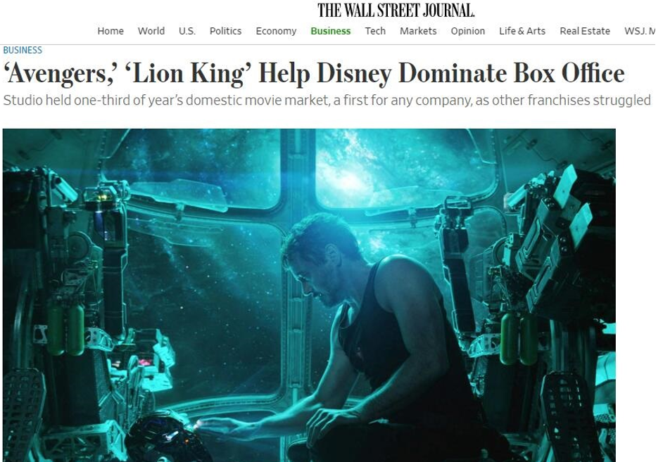 华尔街日报:“复仇者联盟”、“狮子王”帮助迪士尼成为票房霸主