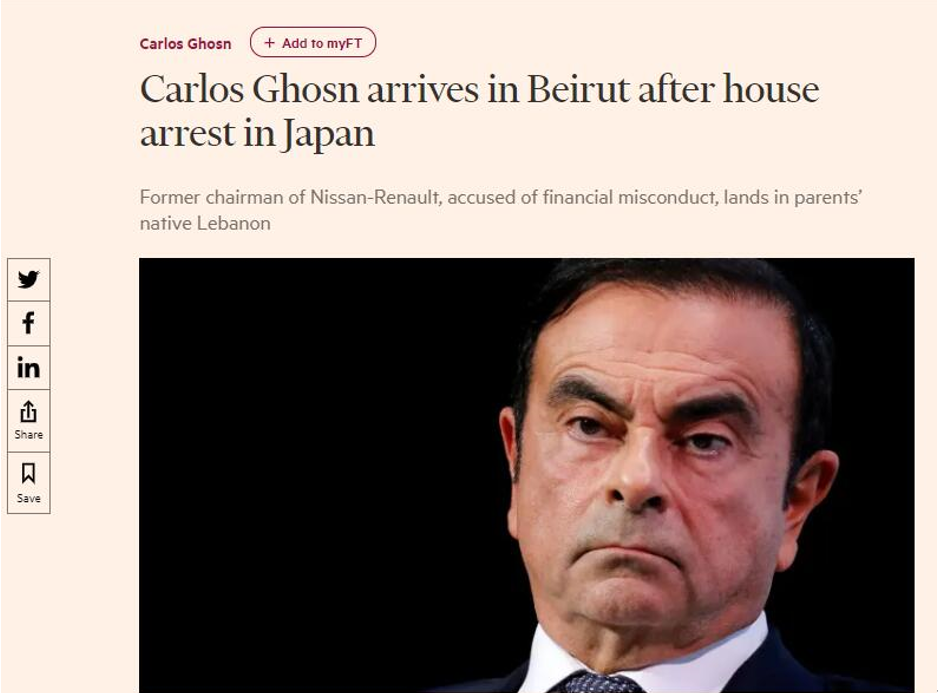 英国金融时报:前雷诺-日产董事长戈恩离开日本抵达黎巴嫩