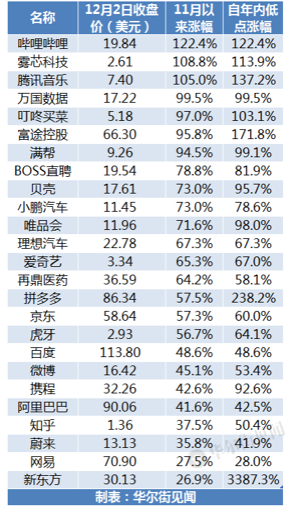 热门中概股中,哔哩哔哩自11月以来累涨逾120%,雾芯科技、腾讯音乐涨逾100%,万国数据、叮咚买菜、富途控股、满帮涨逾90%,Boss直聘、小鹏汽车涨逾70%,拼多多、京东等涨逾50%,百度、阿里巴巴涨逾40%。