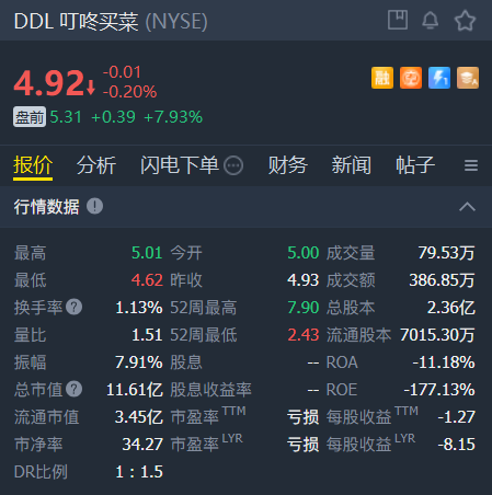 截至2022年12月31日,叮咚买菜拥有现金及现金等价物、短期投资为64.930亿元(约合9.414亿美元),而截至2021年12月31日为52.311亿元。