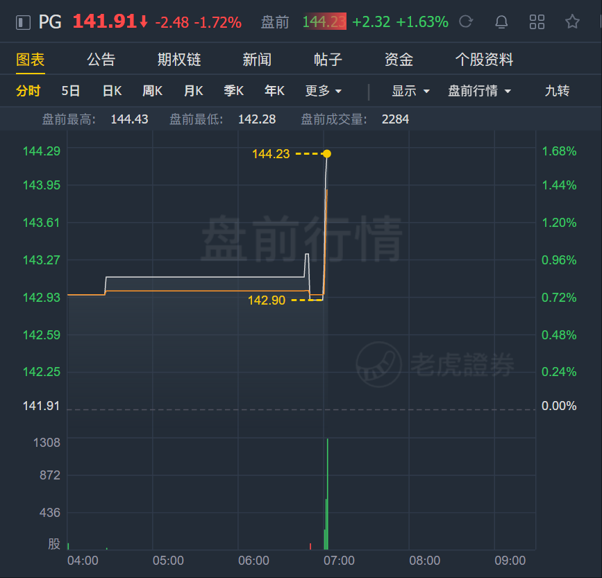 财报发布后,宝洁盘前迅速拉涨,现涨1.63%,报144.23美元。