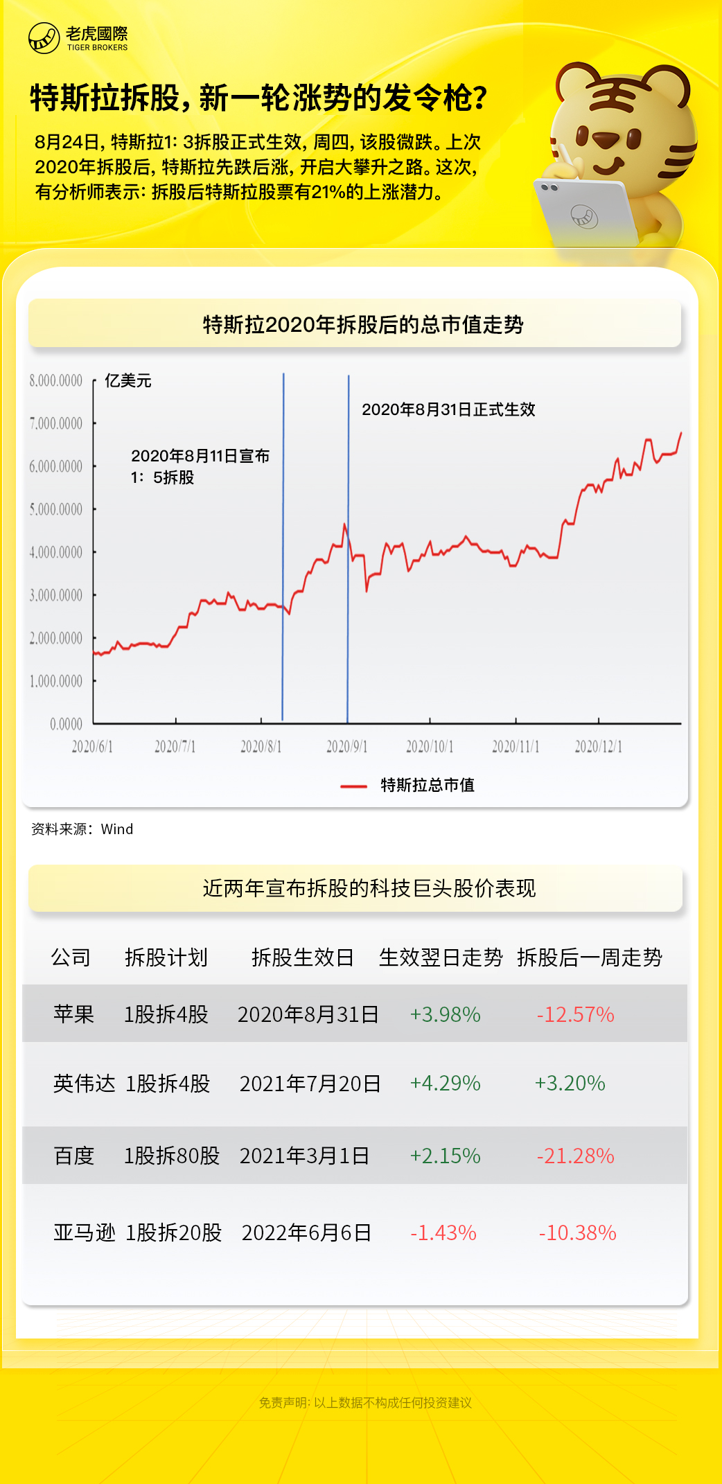 特斯拉1:3拆股8月24日盘后生效,8月25日微跌0.35%。上次2020年拆股后,特斯拉开启了先跌后涨的大攀升之路。这次,美国投行Wedbush分析师Dan Ives表示拆股后特斯拉股票有21%的上涨潜力。让我们回顾历史,来寻找一些参考。