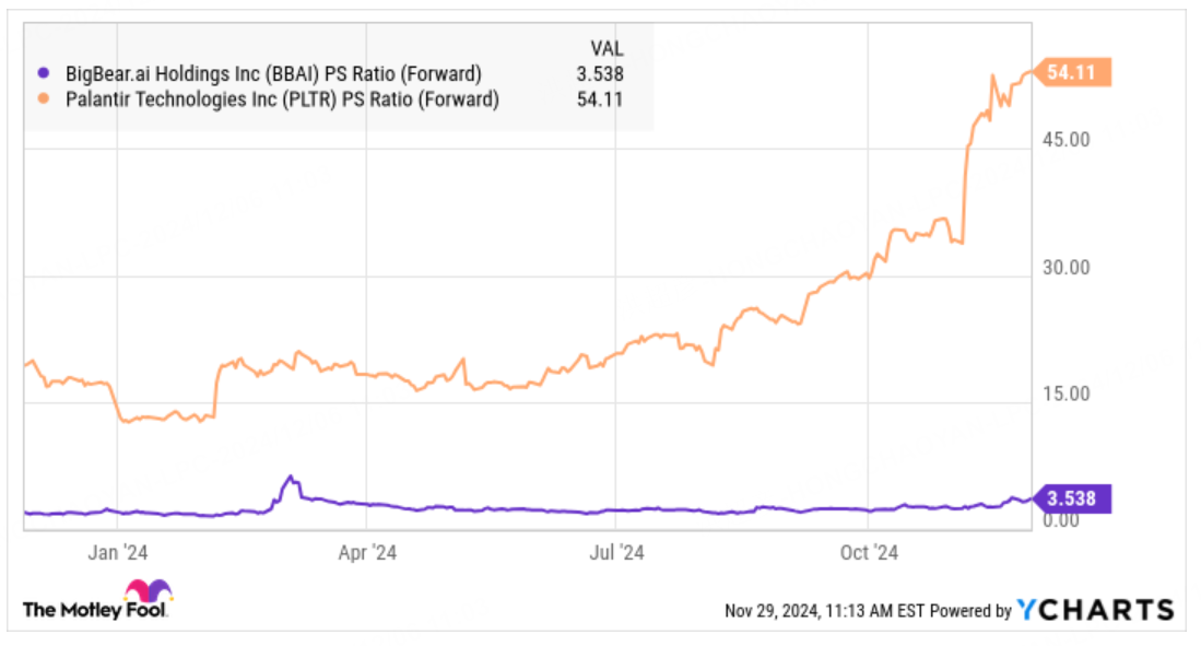 值得一提的是,BigBear.ai的股价以其全年华尔街分析师收入预估为基准的前瞻市盈率(P/S)不到4倍。这一水平远低于Palantir,后者的前瞻市盈率已飙升至惊人的54倍。
