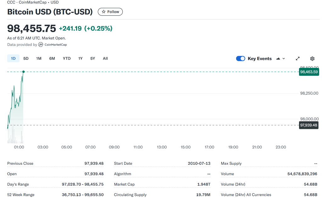 特朗普亲加密货币的态度提振了该行业。周日,比特币一度逼近10万美元后有所回落,现至每枚98455美元。