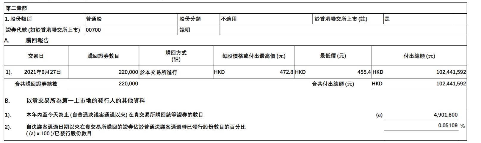 9月27日,据港交所文件:腾讯控股9月27日以455.4-472.8港元的价格回购22万股,耗资约1.02亿港元。