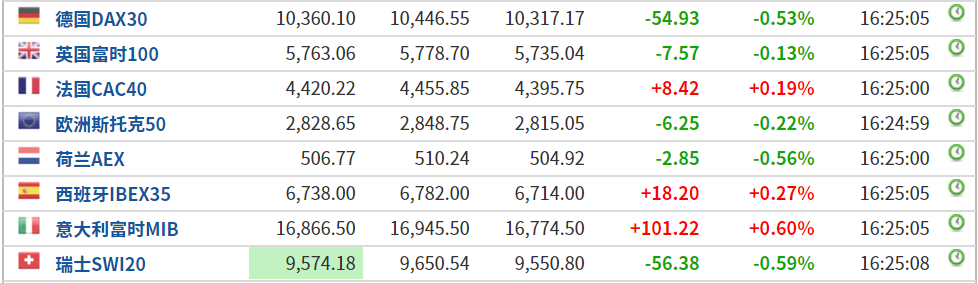 欧洲主要指数涨跌不一,欧洲斯托克50指数跌0.22%,英国富时100指数跌0.13%,德国DAX30指数跌0.53%。