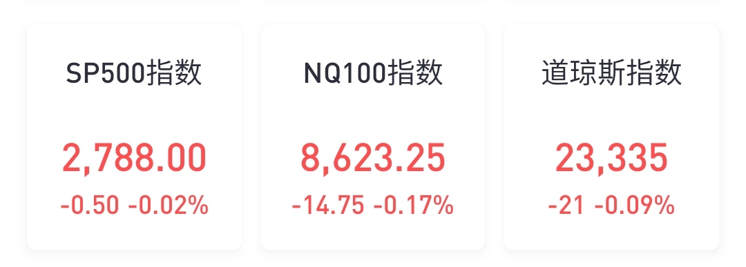 美国三大股指期货盘前微幅下跌,截至发稿,道指期货跌0.09%;标普500指数期货跌0.02%;纳斯达克100指数期货跌0.17%。